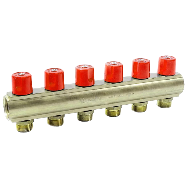 Розподільчий колектор з шістьма вентилями, з виходами НР підходить для мідних фітингів, PEX, полібутиленові або металопластикових трубопроводів.