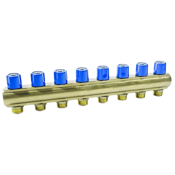 Розподільчий колектор з вісьмома вентилями, з виходами НР підходить для мідних фітингів, PEX, полібутиленові або металопластикових трубопроводів.