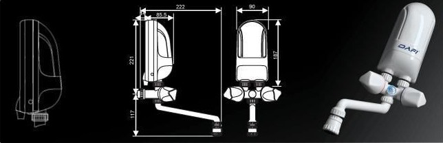 Електричний водонагрівач DAFI був розроблений для подачі гарячої води в будь-яку точку системи водопостачання. Невеликі розміри дозволяють встановлювати обігрівачі DAFI якомога ближче до раковини, ванні або душовій кабіни, що забезпечує економію часу, води і енергії. DAFI бере електроенергію тільки при подачі гарячої води.