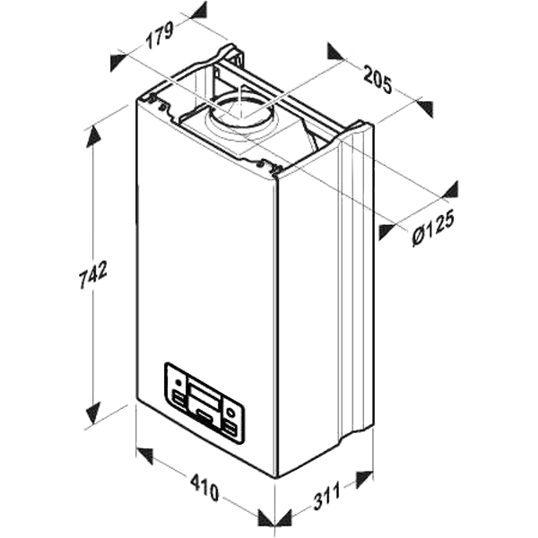 Гідравлічний модуль складається з вбудованого двоступеневого циркуляційному насосу, пріоритетного вентиля з електроприводом, розширювального 5-літрового бака, автоматичного клапана відводу повітря, запобіжно клапана, крана підживлення