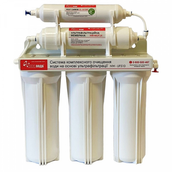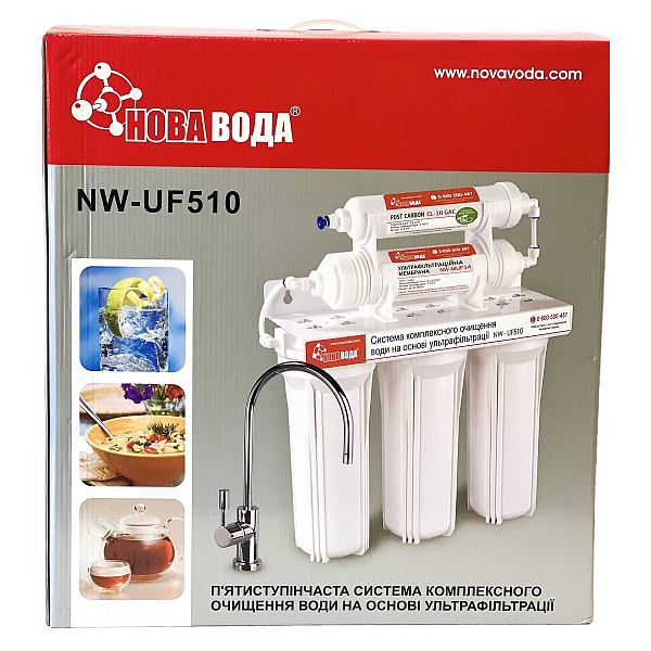 Проточний фільтр НОВА ВОДА NW-UF510 — це чотириступенева система очищення води, яка поєднує механічну, вугільну та ультрафільтраційну технології. Завдяки наявності капілярної мембрани, система ефективно видаляє не лише механічні домішки та хлор, а й бактеріальні забруднення, забезпечуючи високий рівень очищення питної води без потреби у накопичувальному баку чи насосі.