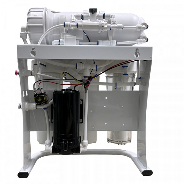 Дана модель - гарне рішення для приватних будинків, особливо де стік збирається в ямі, тому що тут витрата води в каналізацію в 3-4 рази менша від стандартних систем. Система укомплектована помпою, що дозволяє встановлювати фільтр у приватних будинках зі своєю свердловинною, а також на тих об'єктах, де тиск, що входить менше 2 атмосфер. Помпа забезпечує стабільний тиск для коректної роботи фільтра. Для роботи фільтра потрібне підключення до електрики. Система комплектується стильним краном Modern, який чудово підійде до інтер'єру будь-якої кухні.