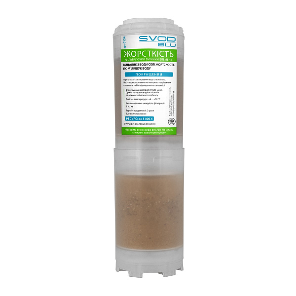 Картридж пом'якшуючий "SVOD BLU" містить засипку з високою здатністю заміни іонів кальцію і магнію на іони натрію. Призначений для пом'якшення холодної води від солей жорсткості. Запобігає утворенню накипу.