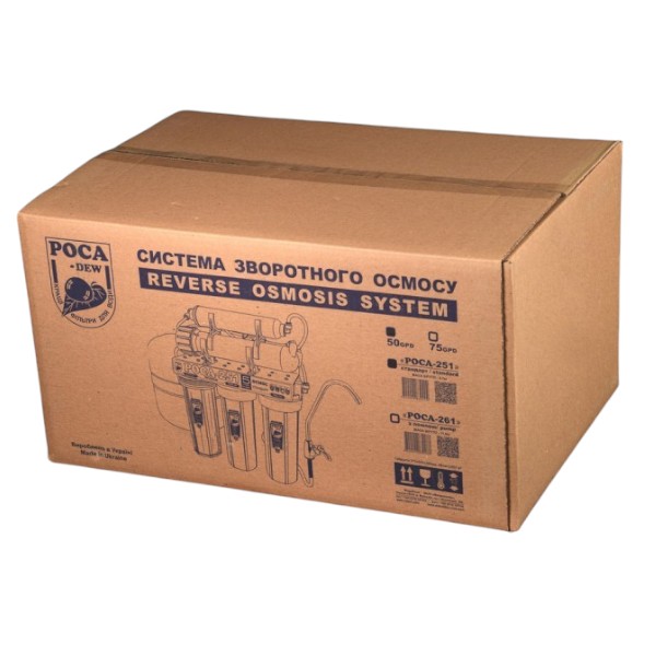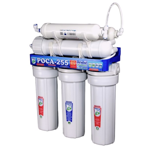 Трьохкорпусний блок з уніфікованими 10-дюймовими картриджами "РОСА-511" 20м, "РОСА-541", "РОСА-511" 5м призначений для попереднього очищення води перед мембраною. Мембрана зворотного осмосу "РОСА 581" пропускає тільки H2O, направляючи все, що не пройшло через неї в дренаж. Так само, як і в побутових системах інших виробників вихід чистої води складає 20 - 25% від загальної кількості води. На цей показник впливають температура, тиск і вміст солей.