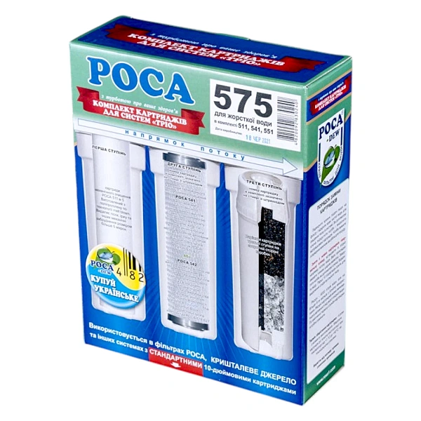 Роса-575 Тріо для жорсткої води - це спеціалізований комплект змінних картриджів для побутових трьохступеневих фільтрів. Набір призначений для пом'якшення води, видалення механічних домішок, хлору, органічних речовин та покращення смаку. Ідеально підходить для регіонів із підвищеною жорсткістю води та для захисту побутової техніки.