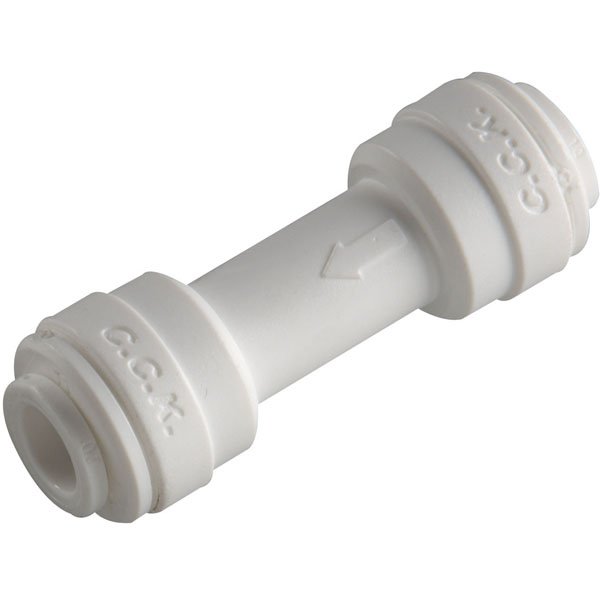 Зворотний клапан CV-06-14P-EZ призначений для використання в системах зворотного осмосу. Має два швидкоз’ємні цангові з'єднання для трубки Ø6 мм (1/4") і вбудований клапан для запобігання зворотного потоку води.