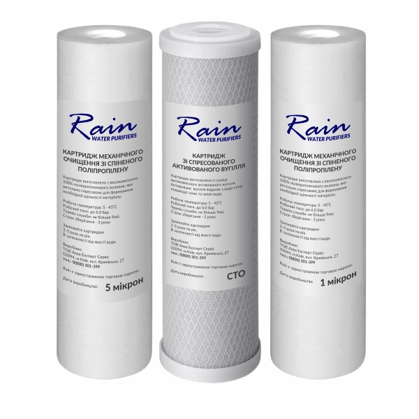 Комплект картриджів рекомендується замінювати кожні 3–6 місяців або раніше — залежно від якості вхідної води та інтенсивності використання. Картриджі не відновлюються та не промиваються. Для стабільної роботи системи осмосу слід використовувати лише оригінальні картриджі RAIN, які гарантують ефективний захист мембрани та стабільну якість очищення.
